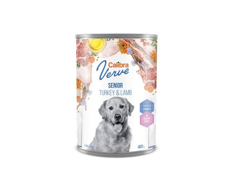 Calibra Dog Verve Grain Free Senior Wet Dog Food with Turkey & Lamb is a complete grain-free wet food for senior dogs over 7 years of age.