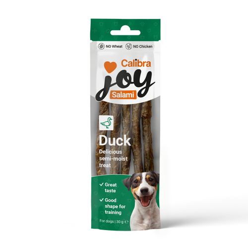 Calibra Joy Duck Salami Treats are premium semi-moist sticks made with 70% real duck and contain no chicken or wheat. Complementary food for dogs.