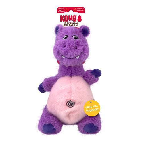 KONG Knots Belly Hippo is soft and cuddly on the outside, with a dense internal skeleton rope ball that adds heft and movement for instinctual thrashing, flinging, and light chewing action. A squeaker in the head entices play. Soft plush exterior is also ideal for carrying and naptime snuggles.