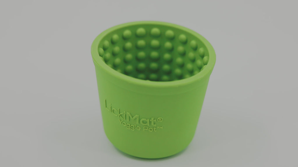 The Yoggie Pot is a fun food and treat licking distractor, providing your dog with an enriching experience based on licking and endorphin release with a wide range of foods. When properly prepared, this LickiMat dog food bowl encourages repetitive licking and slow feeding; it is versatile and can also be used as a full feeder for smaller dogs.