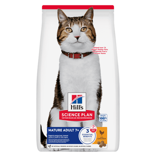 Hill's Science Plan MATURE ADULT CAT FOOD with CHICKEN (chicken 13%; total poultry 20%) is a complete pet food for cats from 7 years old.