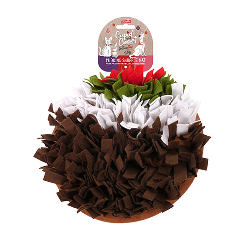 Pets of all types love to forage or hunt for treats. Our durable 30cm diameter Pudding Mat is made from soft, felt fabric threaded through a thicker felt base. Play hide and seek with your pet's favourite dry food or treats. Handwash only in mild detergent, rinse thoroughly and air dry. Ideal for most dogs, rabbits, rodents, ferrets and even cats (ideally with a bit of catnip added!). Important: made with pet-safe fabric, but always supervise your pet and remove the mat if they attempt to chew or eat it. Do not use on light coloured furnishings, especially if damp.